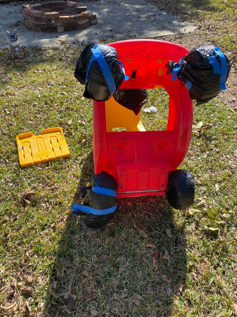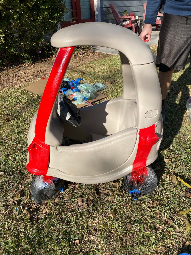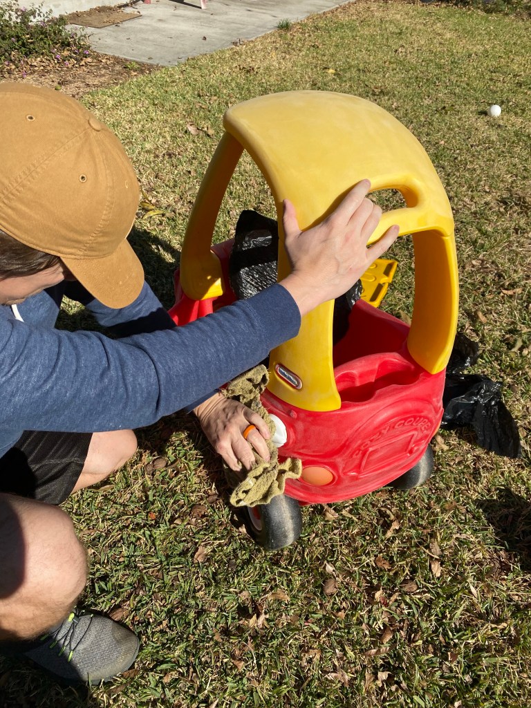 Step 1: Sand down the Cozy Coupe and clean off any debris.