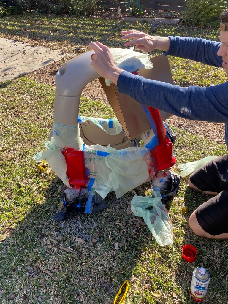 (You will also need to cover the body of the car with trash bags or cardboard to keep the red spray paint from spraying onto the tan portion of the cab.)