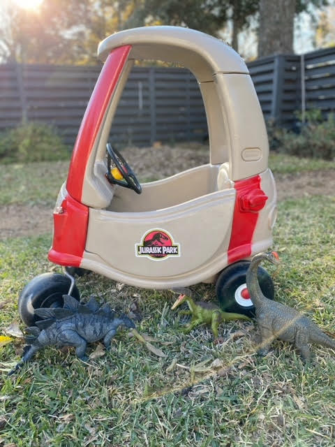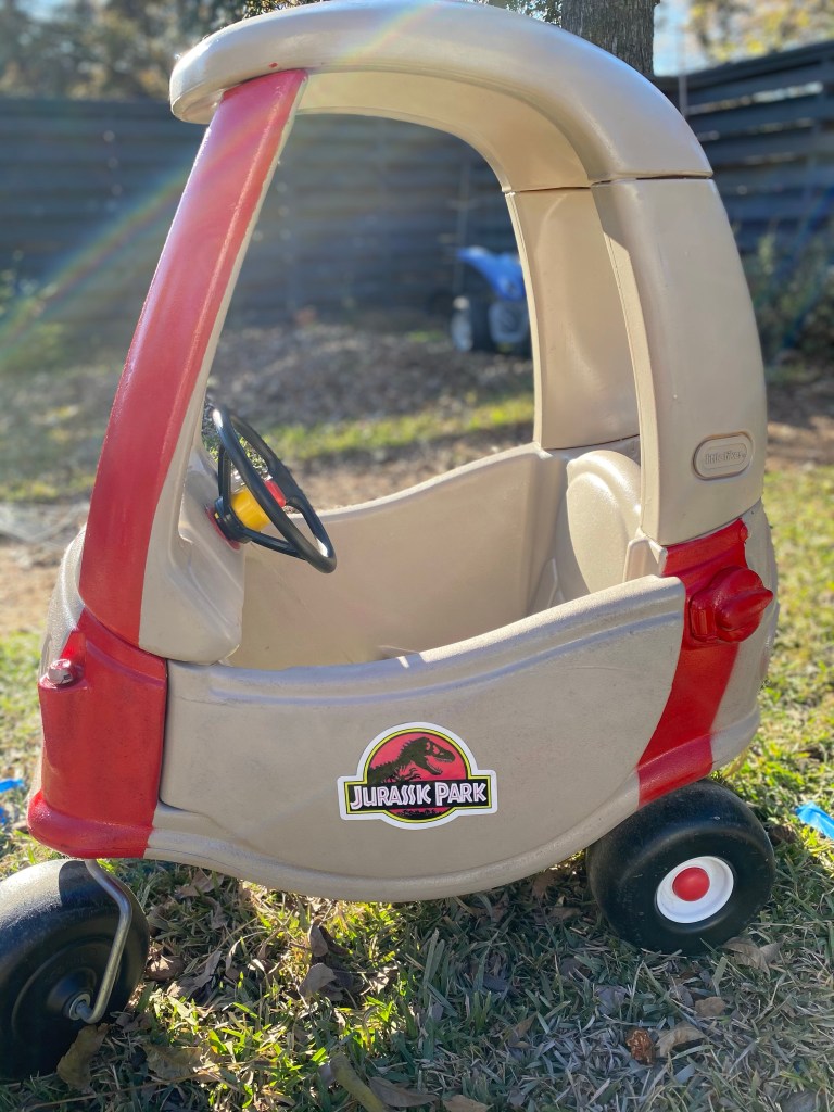 Our son Jake is a huge fan of Jurassic Park. All five of them. At barely 2.5 years of age, he has somehow become obsessed with the film franchise. He absolutely loves all things dinosaurs, has asked us to call him “Tim” (Dr. Hammond’s grandson from the original movie), and has us play the theme song on repeat. So like all parents of an only child, we went out of our way to make his wildest dreams come true… on a budget. Now we are not the first ones to do this. With a simple google search, you can find a ton of really cool ‘Cozy Coupe Makeover’ ideas. We read a few different blogs from people who went with the Jurassic Park idea and took our own stab at it.
